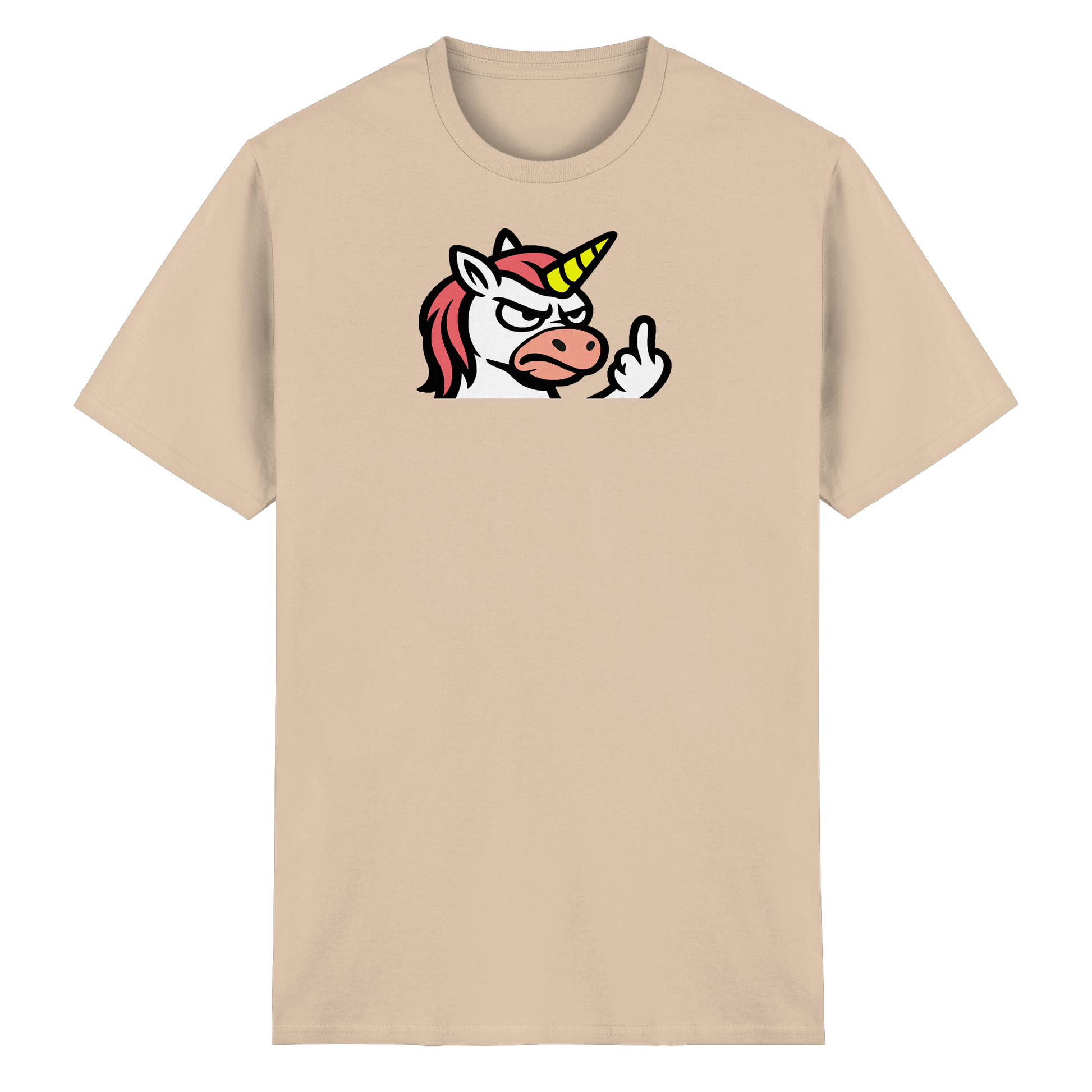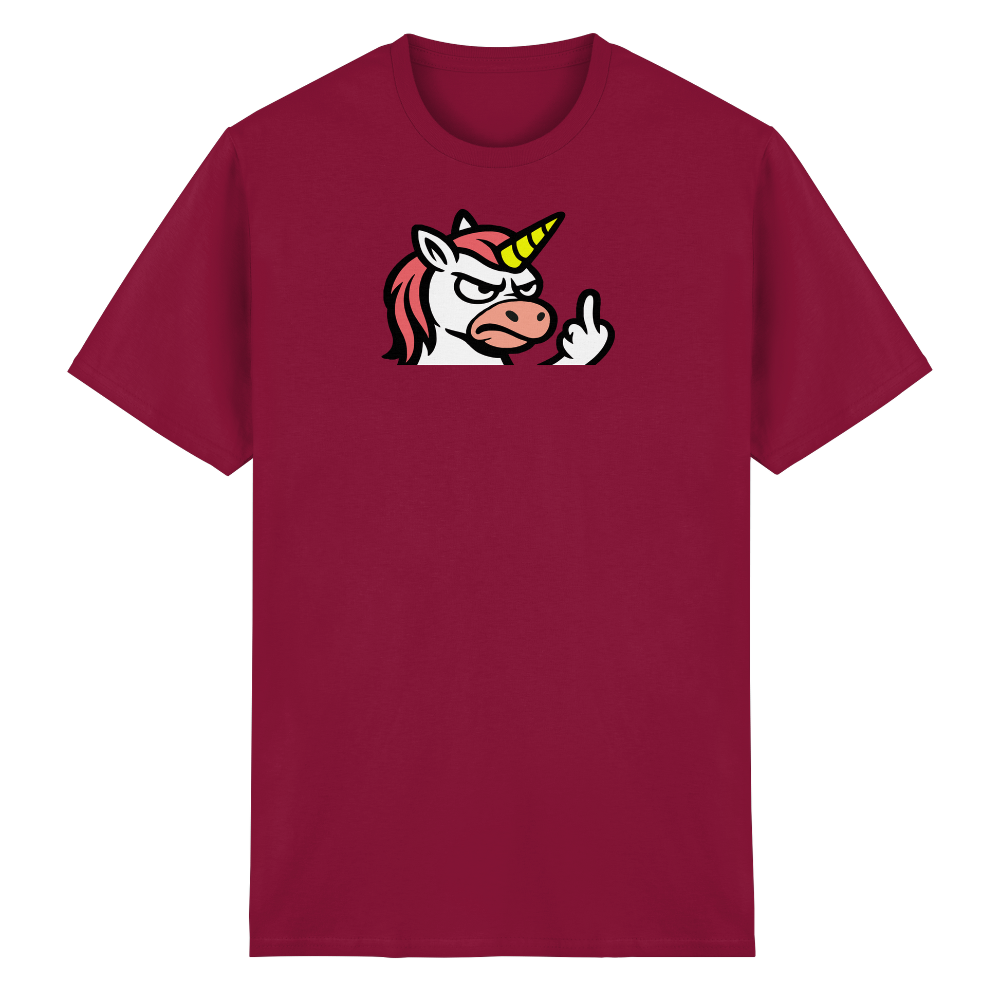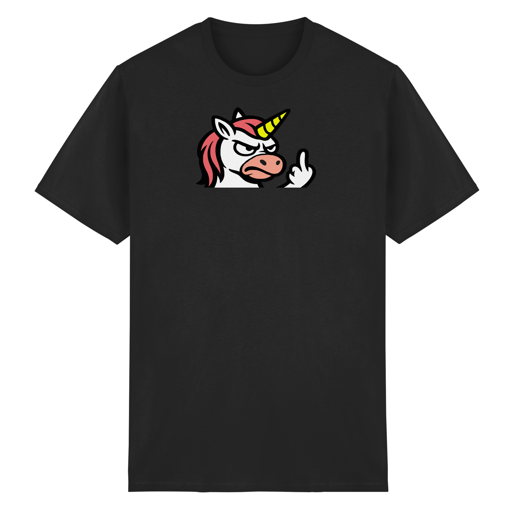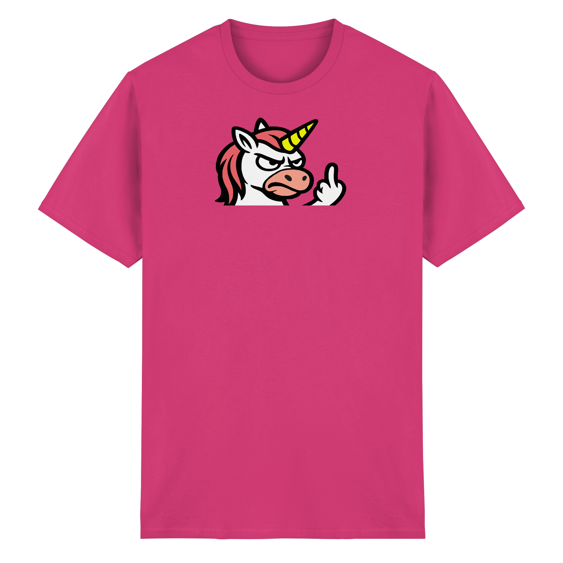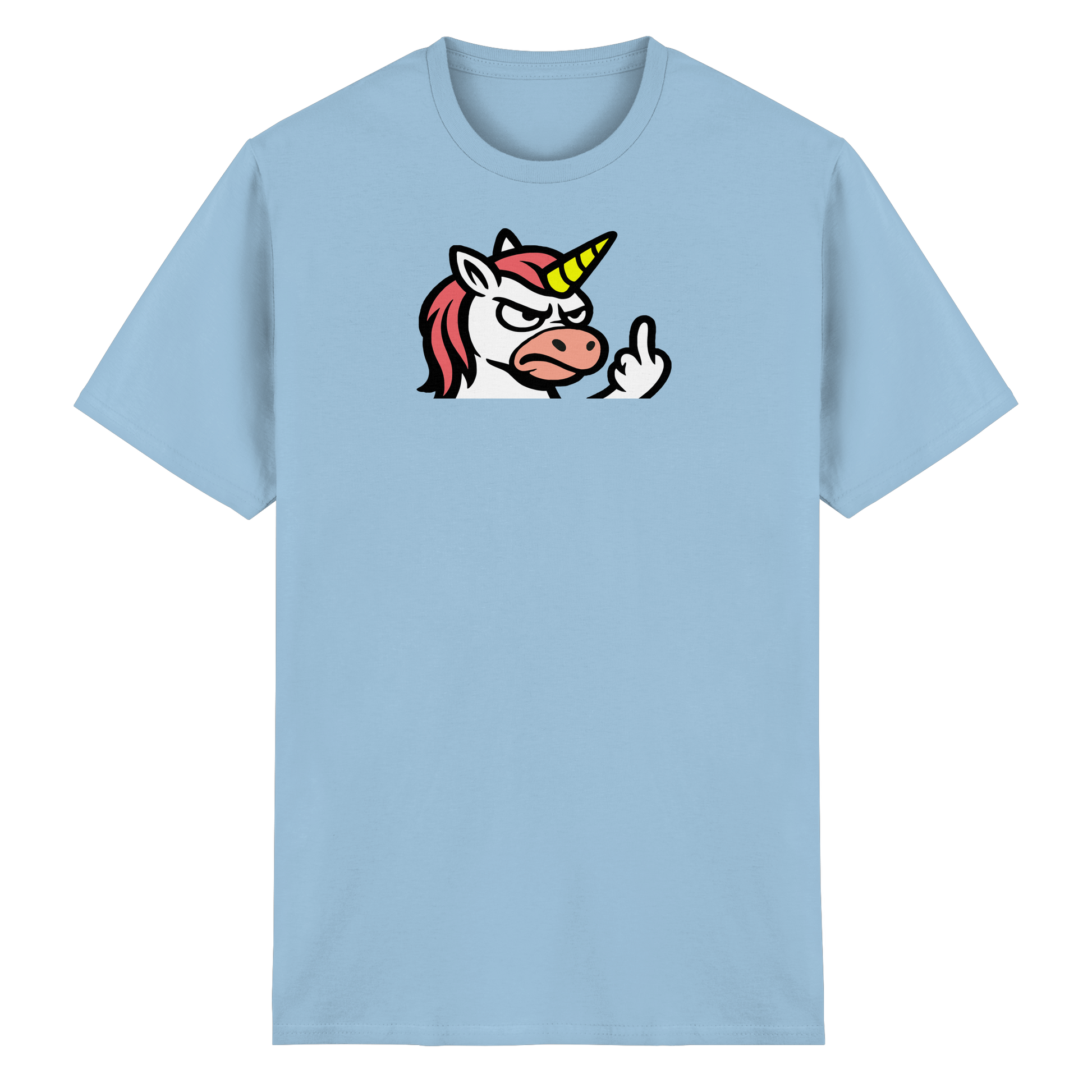 Dieses Einhorn hat keinen Bock mehr auf Glitzerträume und rosa Zuckerwatte. Stattdessen hebt es stolz den Mittelfinger gegen alles, was nervt, stresst oder zu laut redet. Vergiss brav und niedlich – dieses Horn hat Haltung. Dein neues Lieblingsshirt für den Tag, an dem dich schon morgens jemand vollquatscht. Es verbindet Einhorn-Magie mit ehrlicher Rebellion – wie ein Regenbogen mit Attitüde. Knallhart in der Aussage, aber charmant im Look. Denn wer sagt, dass frech nicht auch fantastisch sein kann?