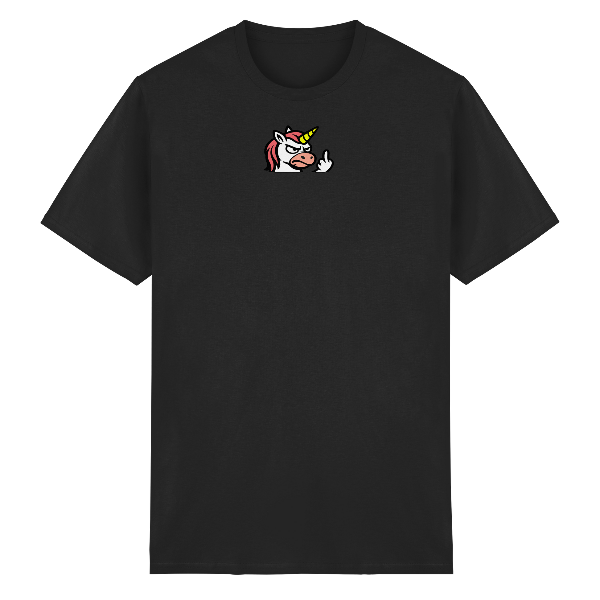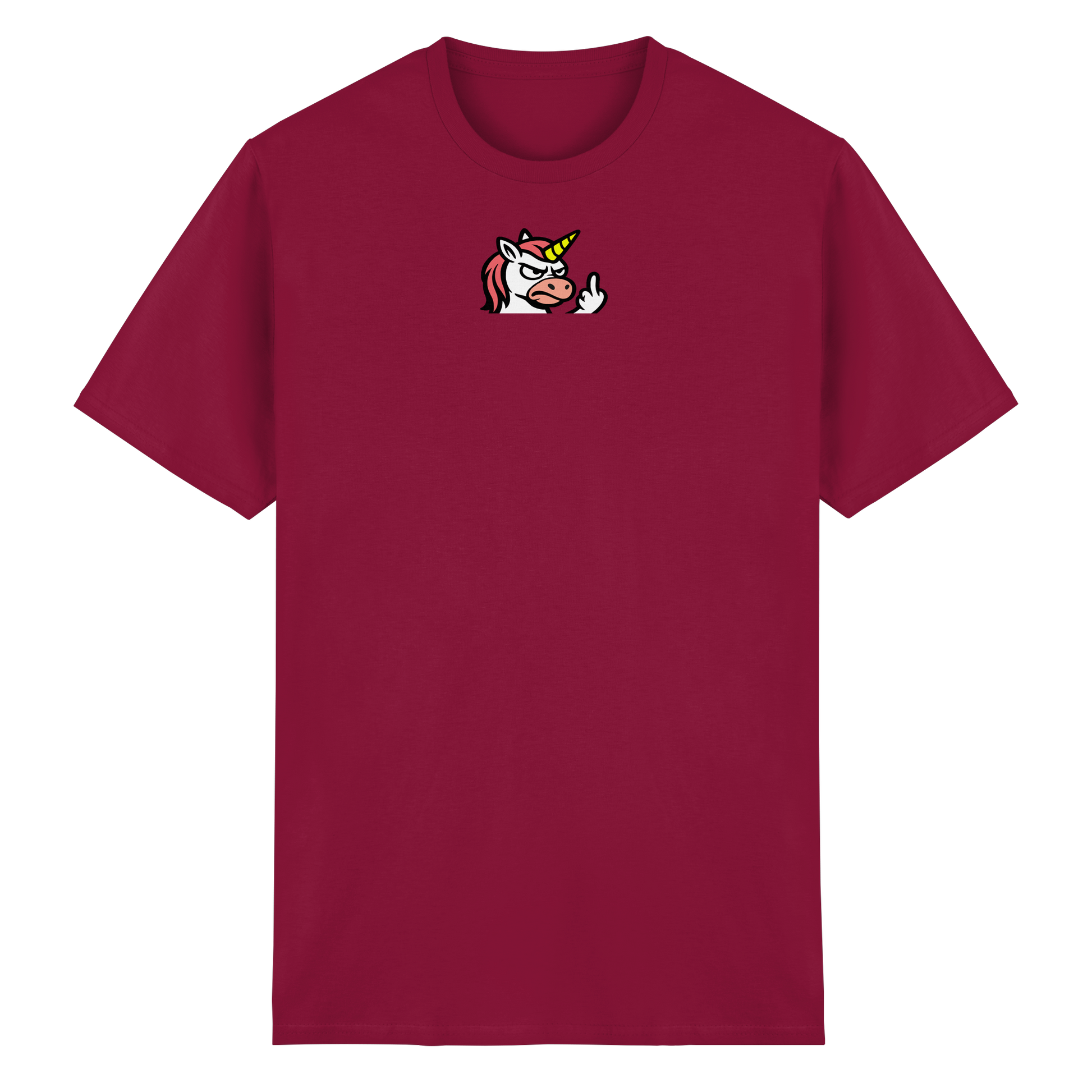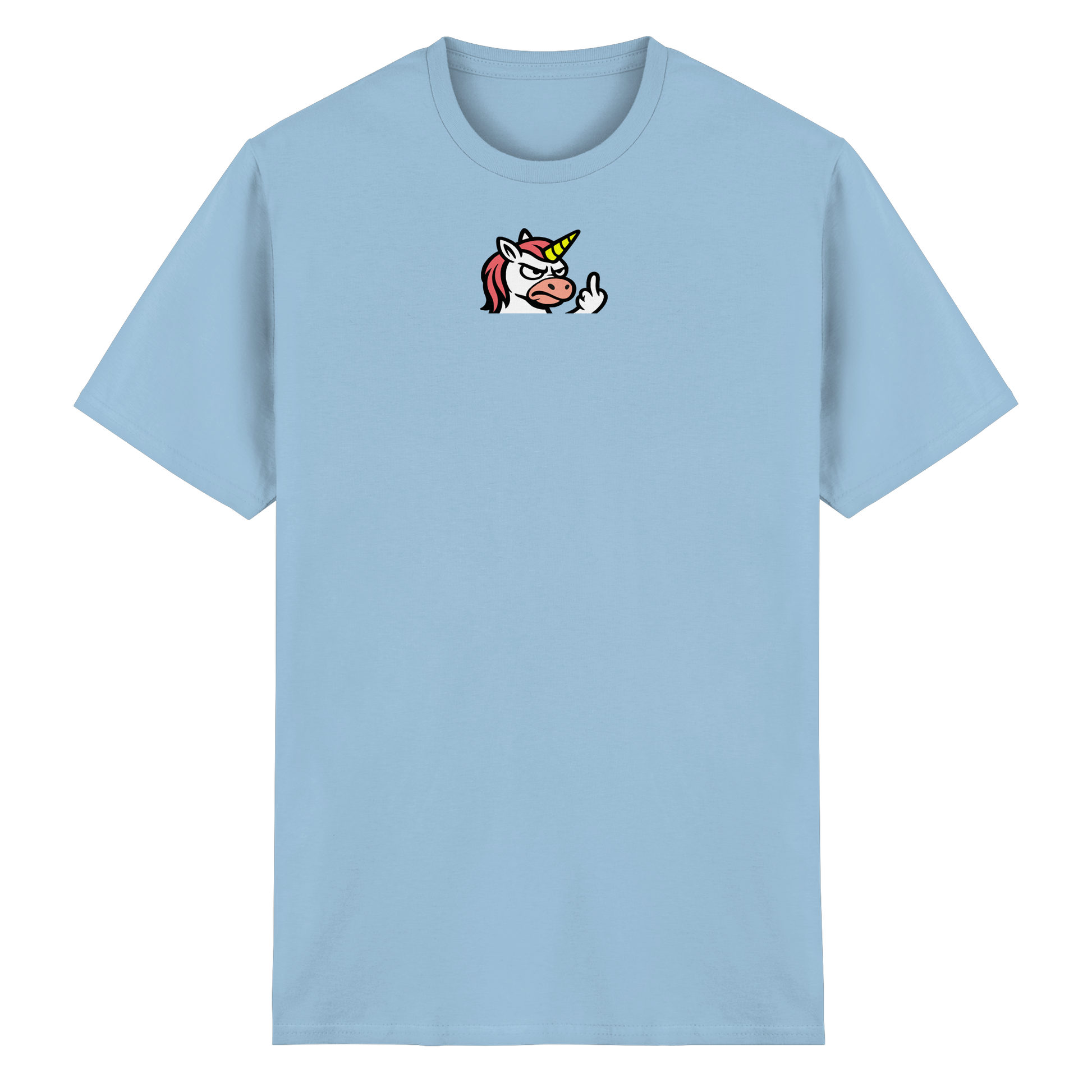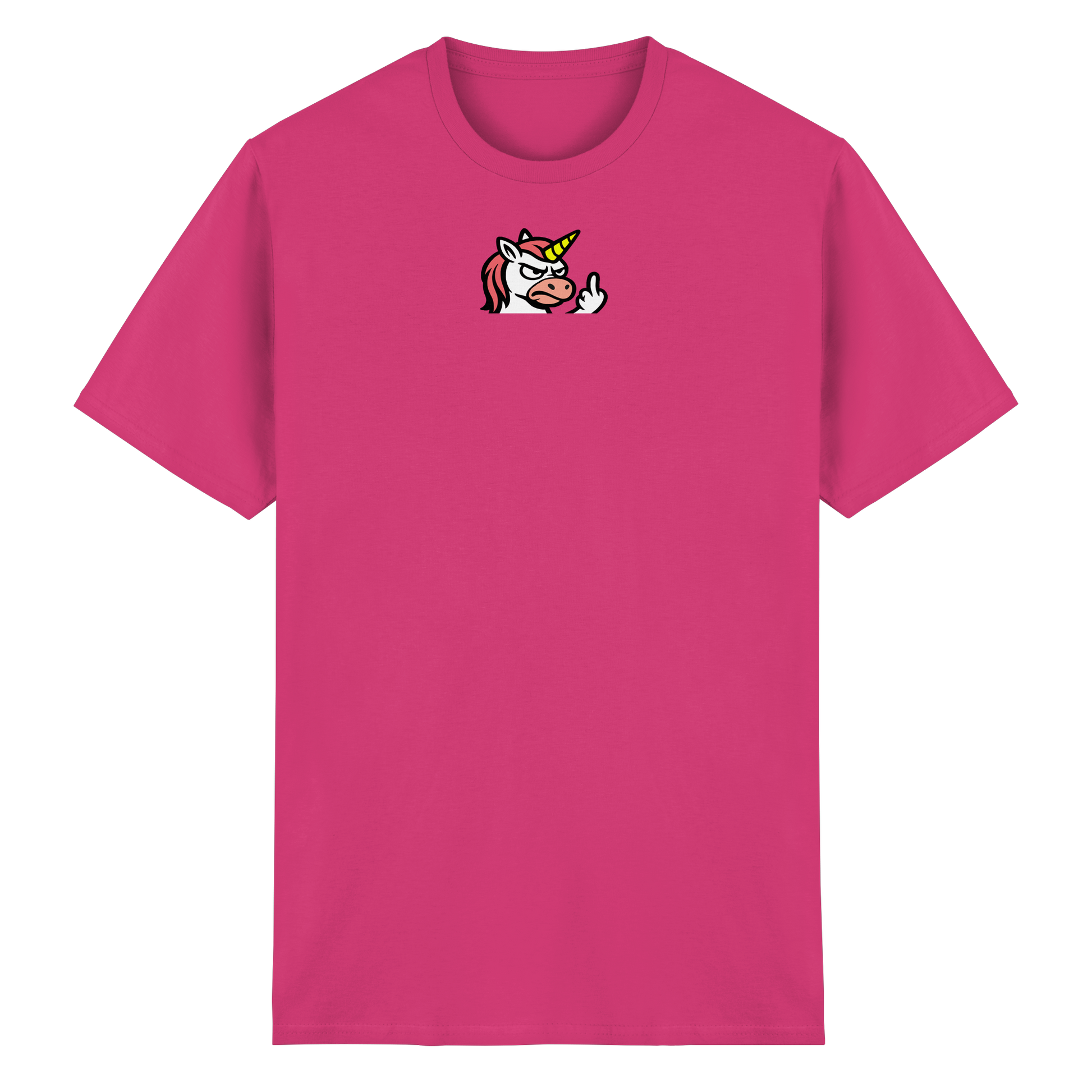 Dieses Einhorn hat keinen Bock mehr auf Glitzerträume und rosa Zuckerwatte. Stattdessen hebt es stolz den Mittelfinger gegen alles, was nervt, stresst oder zu laut redet. Vergiss brav und niedlich – dieses Horn hat Haltung. Dein neues Lieblingsshirt für den Tag, an dem dich schon morgens jemand vollquatscht. Es verbindet Einhorn-Magie mit ehrlicher Rebellion – wie ein Regenbogen mit Attitüde. Knallhart in der Aussage, aber charmant im Look. Denn wer sagt, dass frech nicht auch fantastisch sein kann?