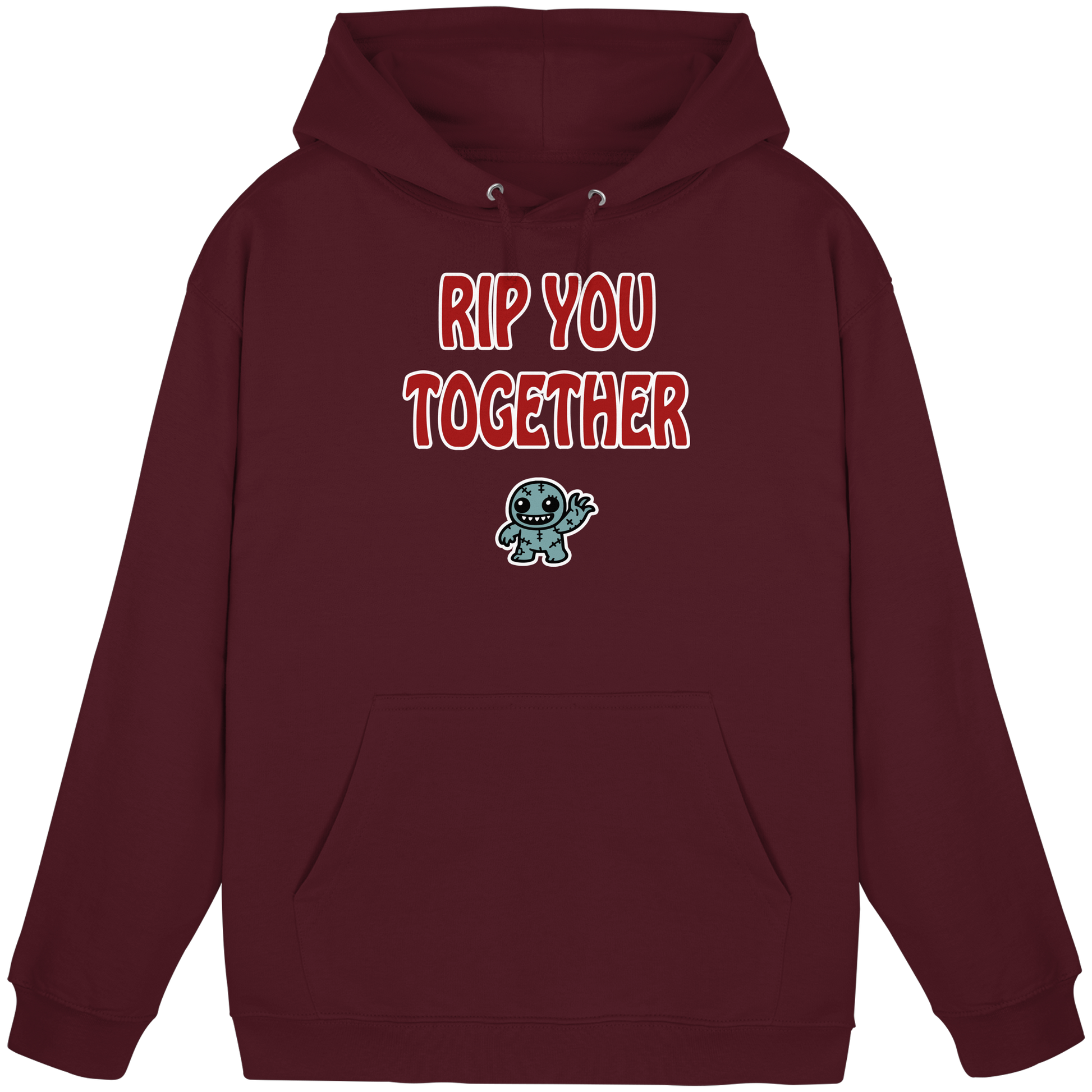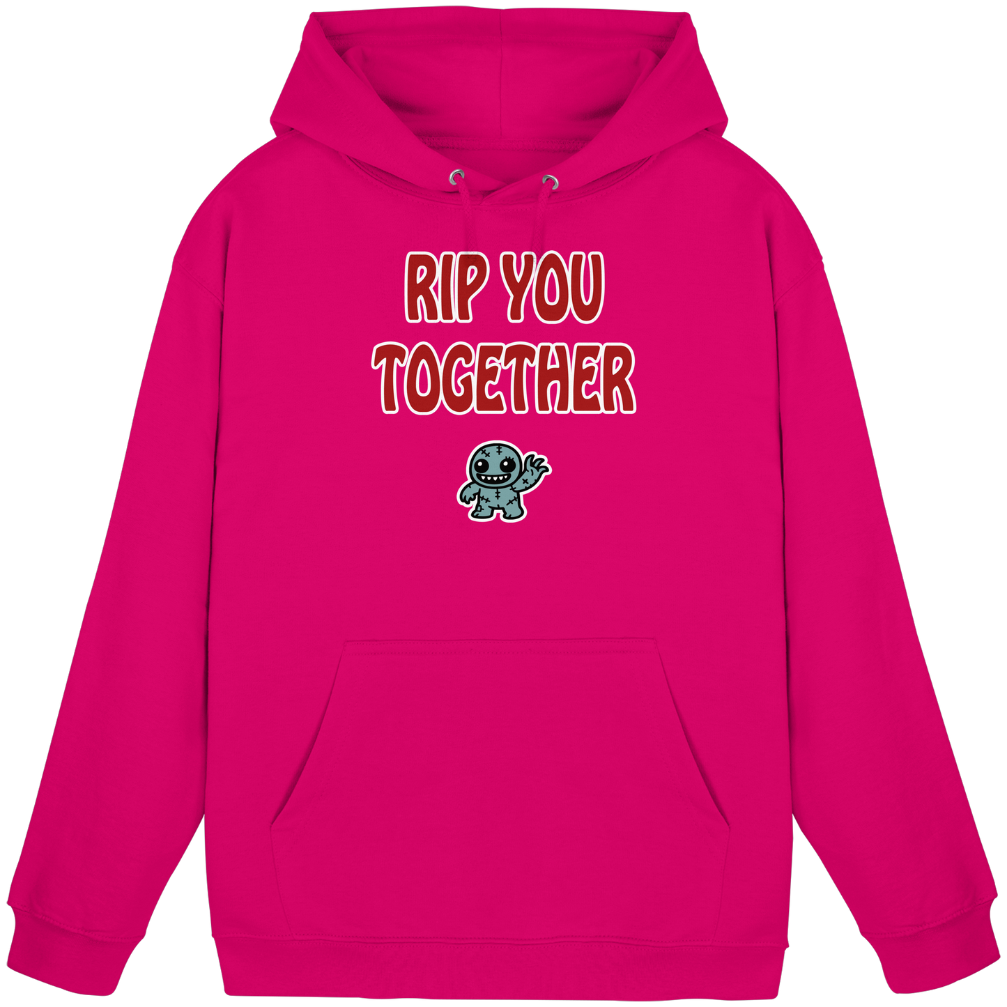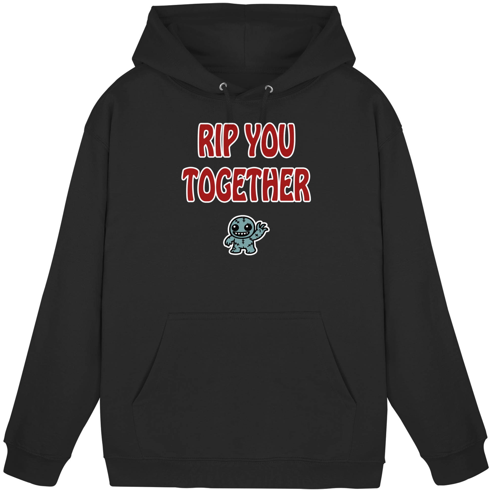 Mit diesem Motiv schickst du eine charmant-morbide Botschaft in die Welt: „Rip you together“ – eine schön schiefe Übersetzung von „Reiß dich zusammen“. Darunter ein niedlicher Zombie, der fröhlich winkt, als wolle er sagen: Hey, alles easy … oder ich reiß dich halt auseinander. Dieses Design spielt perfekt mit Kontrasten: supersüß auf den ersten Blick, leicht verstörend auf den zweiten. Genau wie du, wenn du lächelst, obwohl du innerlich schon längst am Limit bist. Der winkende Zombie steht für diesen Moment zwischen „Ich hab’s im Griff“ und „Ich eskaliere gleich komplett“ – und er macht das Ganze sogar noch sympathisch. Ob im Büro, bei der nächsten WG-Diskussion oder auf einem Rave, bei dem einfach gar nichts mehr nach Plan läuft – mit diesem Motiv setzt du ein klares Statement: Ich bin friedlich … solange man mich lässt.