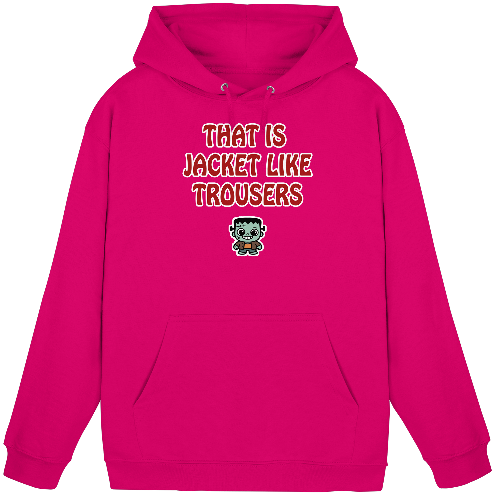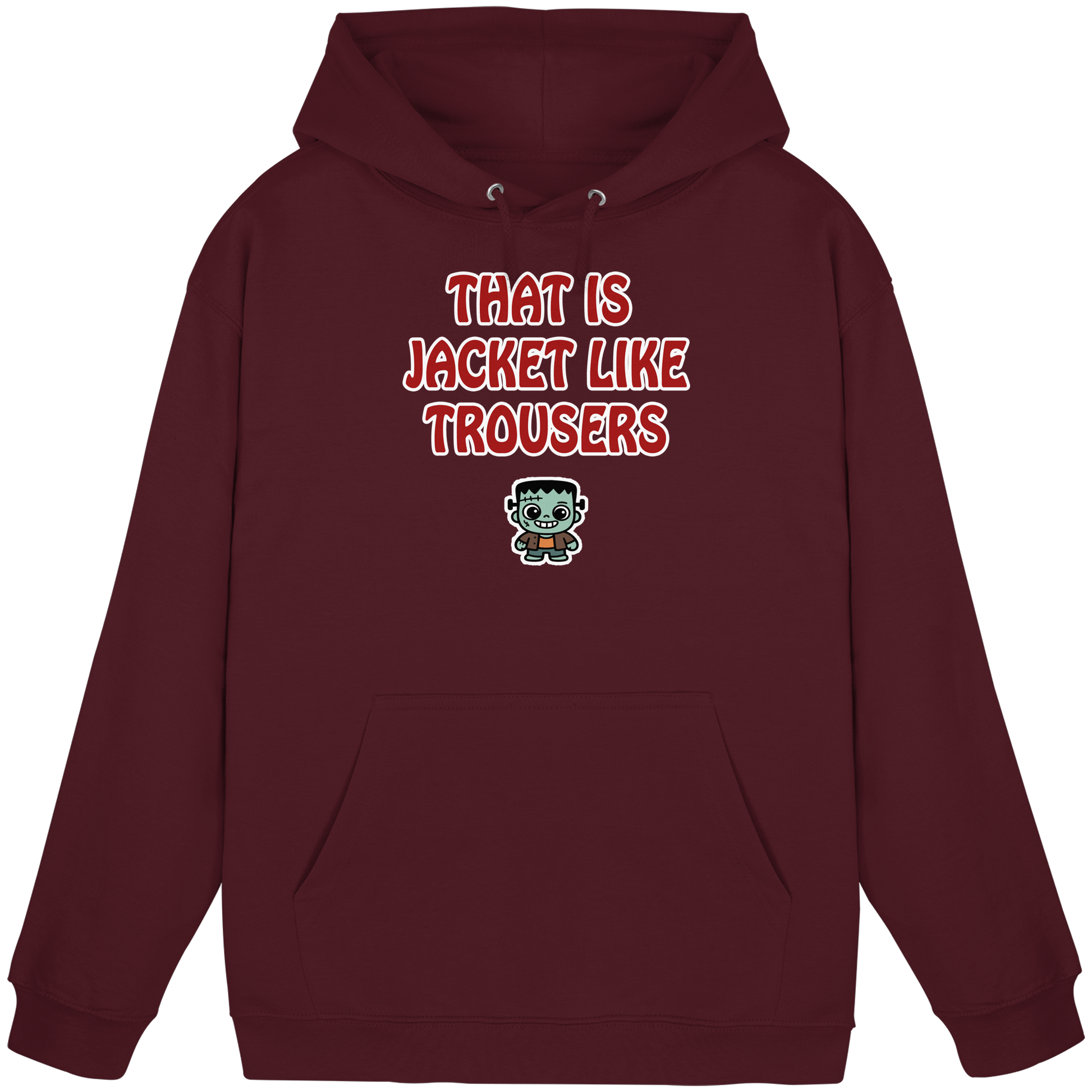 Mit diesem Motiv feierst du die Königsdisziplin der deutschen Redewendungen: „That is jacket like trousers“ – die genial schiefe Übersetzung von „Jacke wie Hose“. Darunter ein kleiner Frankenstein, der genau diesen Mood verkörpert: ein bisschen schief zusammengesetzt, aber am Ende passt’s trotzdem irgendwie. Dieses Design ist pures Understatement: Es sagt, dass dir die Details egal sind – Hauptsache, es funktioniert. Ob Jacke oder Hose, perfekt oder provisorisch, Chaos oder Ordnung – du machst einfach dein Ding. Der kleine Frankenstein ist dabei dein Maskottchen: charmant unfertig, ironisch perfekt und immer ein Beweis dafür, dass anders sein der wahre Style ist. Ob im Alltag, bei spontanen Entscheidungen oder auf dem Festival im totalen Ausnahmezustand – mit diesem Motiv machst du klar: Alles egal, Hauptsache du bist dabei.