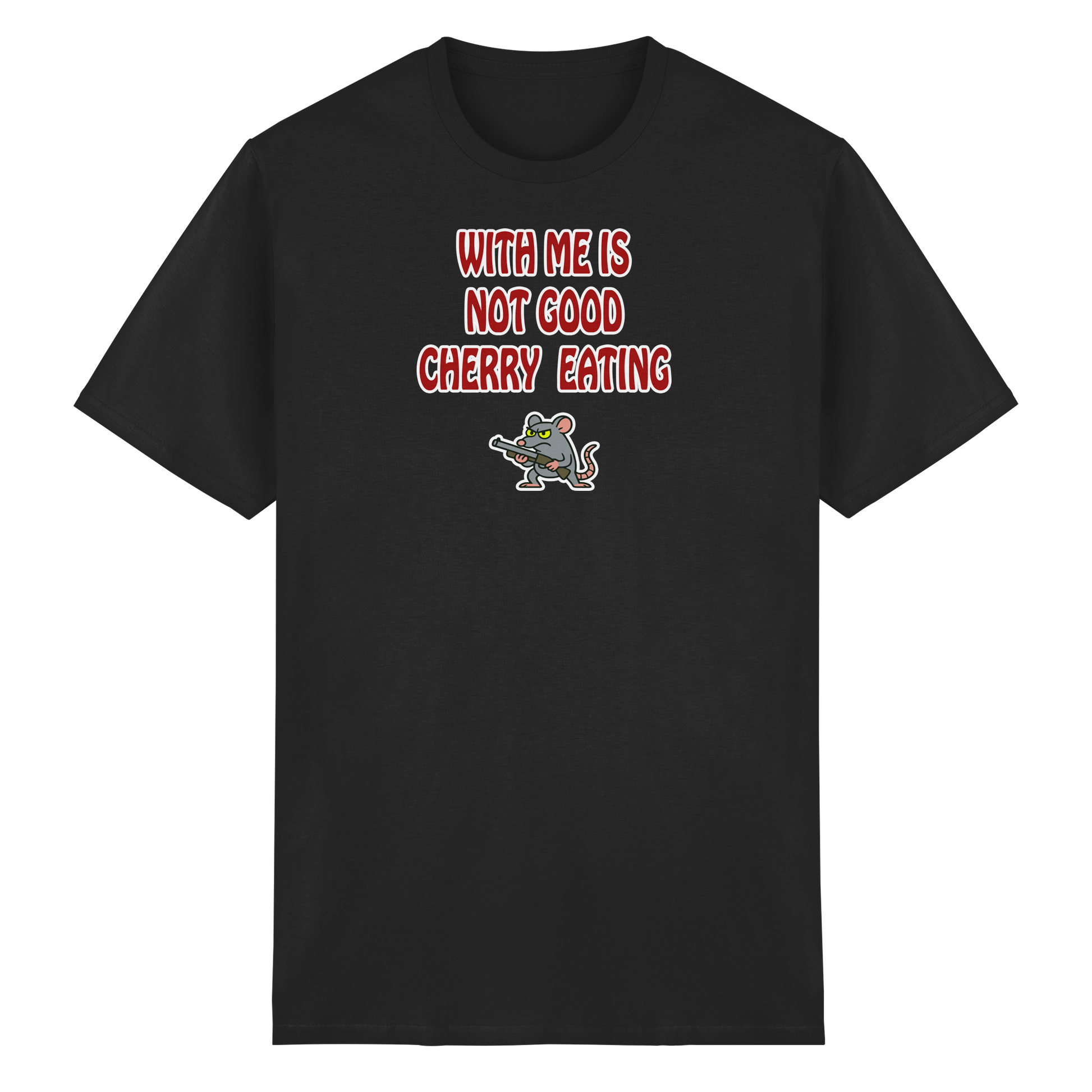 Mit diesem Motiv schickst du eine klare Warnung: „With me is not good Cherry eating“ – die köstlich krumme Übersetzung von „Mit mir ist nicht gut Kirschen essen“. Darunter eine Ratte mit Schrotflinte, die auf den ersten Blick niedlich wirkt … bis man merkt, dass sie absolut keinen Bock auf Spielchen hat. Dieses Design ist für all die Momente, in denen du süß aussiehst, aber innerlich längst beschlossen hast: Bis hierhin und nicht weiter. Die Ratte steht für diesen Vibe perfekt – klein, unterschätzt, aber schwer bewaffnet mit Attitüde (und Schrotflinte). Ob WG-Diskussion, nervige Kollegen oder Festival-Chaos – mit diesem Motiv machst du klar: Man kann’s mit dir gut haben, aber nur solange man’s nicht übertreibt.