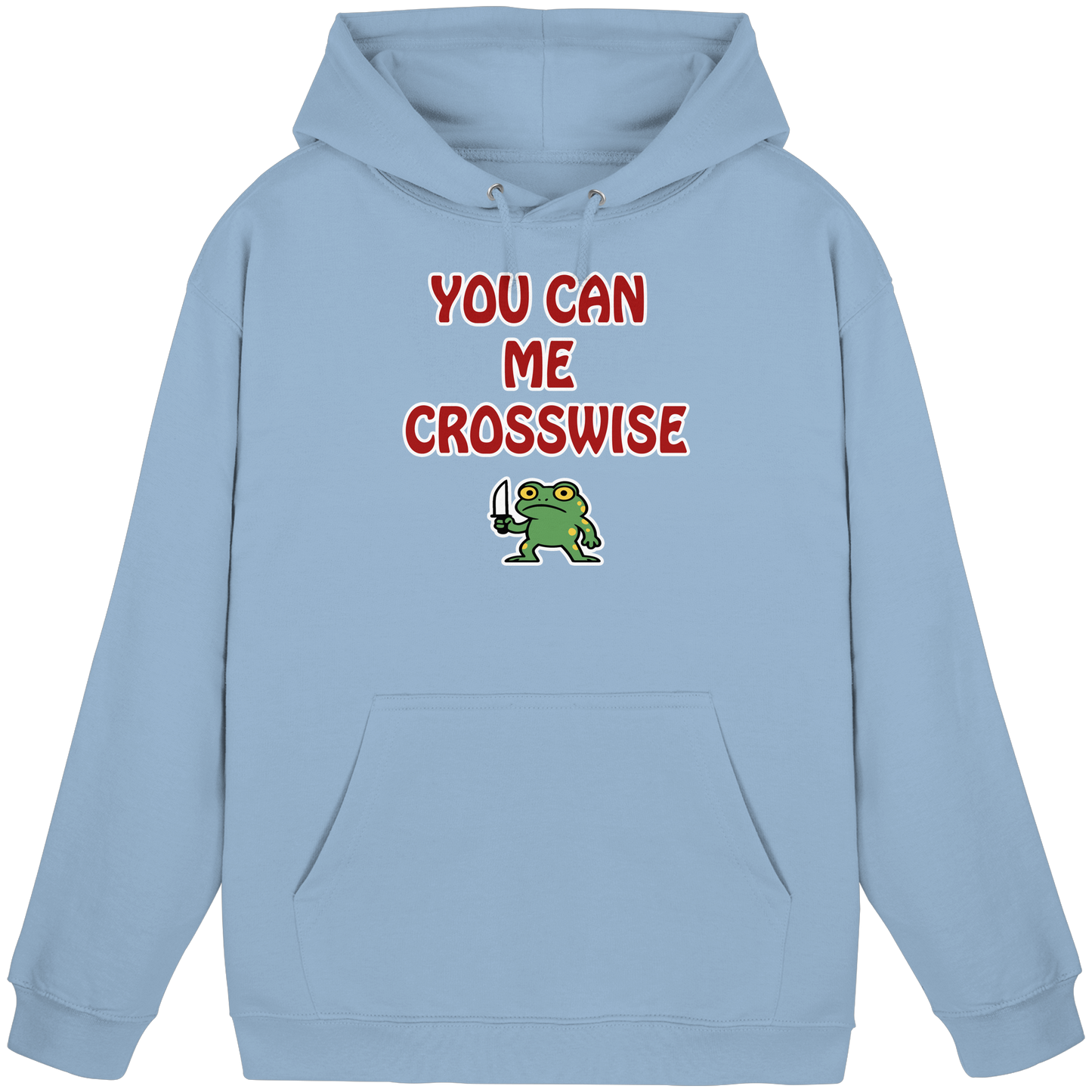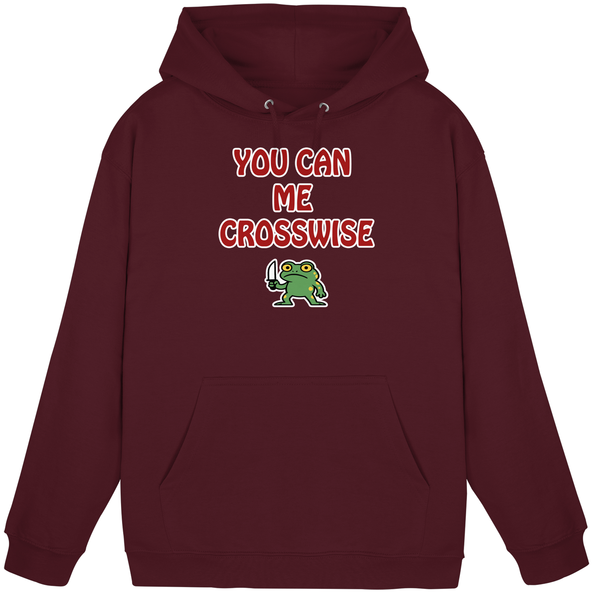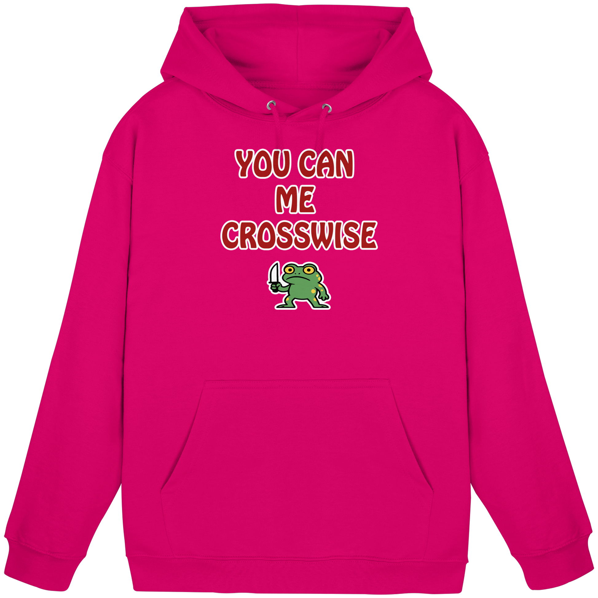 Mit diesem Design servierst du eine Ansage, die schärfer ist als das Accessoire des Motivs: „You can me crosswiese“ – die wunderbar verunglückte Übersetzung von „Du kannst mich kreuzweise“. Darunter ein Frosch mit Messer, der so entschlossen schaut, als würde er niemanden ohne klare Botschaft vom Teich lassen. Dieses Design ist pure Ironie: klein, grün, niedlich – und trotzdem bereit, jedem auf charmant-aggressive Art die Grenzen zu zeigen. Der Frosch ist dein perfekter Sidekick, wenn du mal wieder keine Lust auf Diskussionen, Drama oder nervige Menschen hast. Freundlich bleiben? Kann man. Muss man aber nicht. Ob Festival-Moshpit, WG-Debatten oder ein Montagmorgen im Büro – mit diesem Motiv machst du klar: Heute kein Bock, aber definitiv Style.